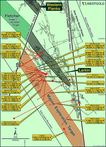 Figure 5 – Location of Mason Exploration Target and significant historical drill intersections. (CNW Group/Westgold Resources Limited)