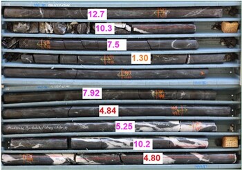 Figure 3 – Drill core from FF475SP-62AE (41.00m at 7.99 g/t Au from 426m) annotated with gold grade in g/t Au highlighting consistency of high-grade results (436.6m to 445.00m displayed). (CNW Group/Westgold Resources Limited)