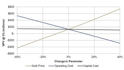 Figure 2: Archimedes Gold Price Sensitivity Cost Analysis (CNW Group/i-80 Gold Corp)