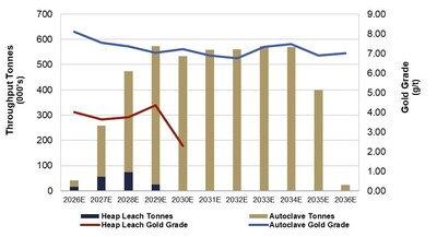 - Overall average gold grade processed of 7.0 g/t with an average gold recovery of 90% (autoclave) and an average expected heap leach grade of 3.8 g/t gold with an average recovery of 87%.
