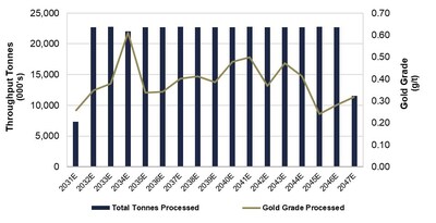 - Material mined will be crushed, stacked and processed at the heap leach facility located on site at a rate of approximately 23 million tonnes per year during steady state.