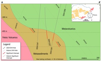 Figure 2: Long section A-A’ showing Pisces exploration target with drill holes (including historic drill holes) annotated (CNW Group/OceanaGold Corporation)