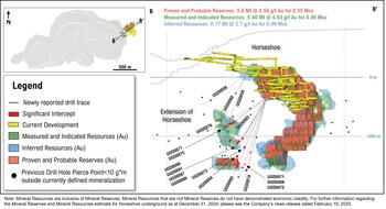 Eighteen additional resource definition holes for 5,587 metres have been completed since the cut-off date for the 2024 year-end resource estimate for the Horseshoe underground (see news release dated February 19, 2025). These holes targeted southwest extensions to Horseshoe and focused on defining the continuity and extent of three zones: the middle zone with 12 holes, the lower zone with 5 holes, and the upper zone with 1 hole (Figure 3). The results received were in line with expectations and support potential additional growth of the Horseshoe underground resource.