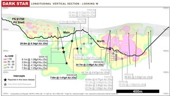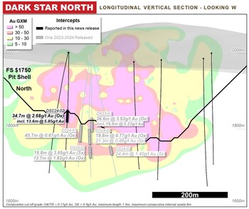Additional drilling near the Dark Star deposit returned significant oxide results. Drillhole DSC24-02 returned 2.68 g/t Au (Ox) over 34.7 m including 5.85 g/t Au over 13.6 m (Ox), confirming the continuity of significant oxide mineralization between the projected open pit an d previously reported results of 0.67 g/t Au over 45.7 m (Ox) including 1.24 g/t Au over 12.2 m (Ox) located approximately 100 m to the NE (see October 31, 2024 news release; Figure 3, 4, and 5).