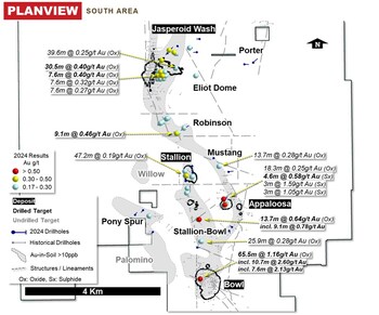 New shallow oxide drill intersections from the Robinson, Stallion-Bowl Trend, Mustang, and Appaloosa targets reinforce the relationship between auriferous structures and gold-in soil anomalies. Orla is encouraged by these early exploration results which highlight further potential for oxide resource growth. Orla intends to continue testing the South Area in 2025.