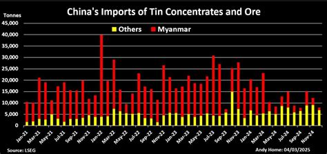 The total imports of raw tin materials in 2024 were down 36% on an annual basis, and were at 156.700 tons the lowest since 2010.