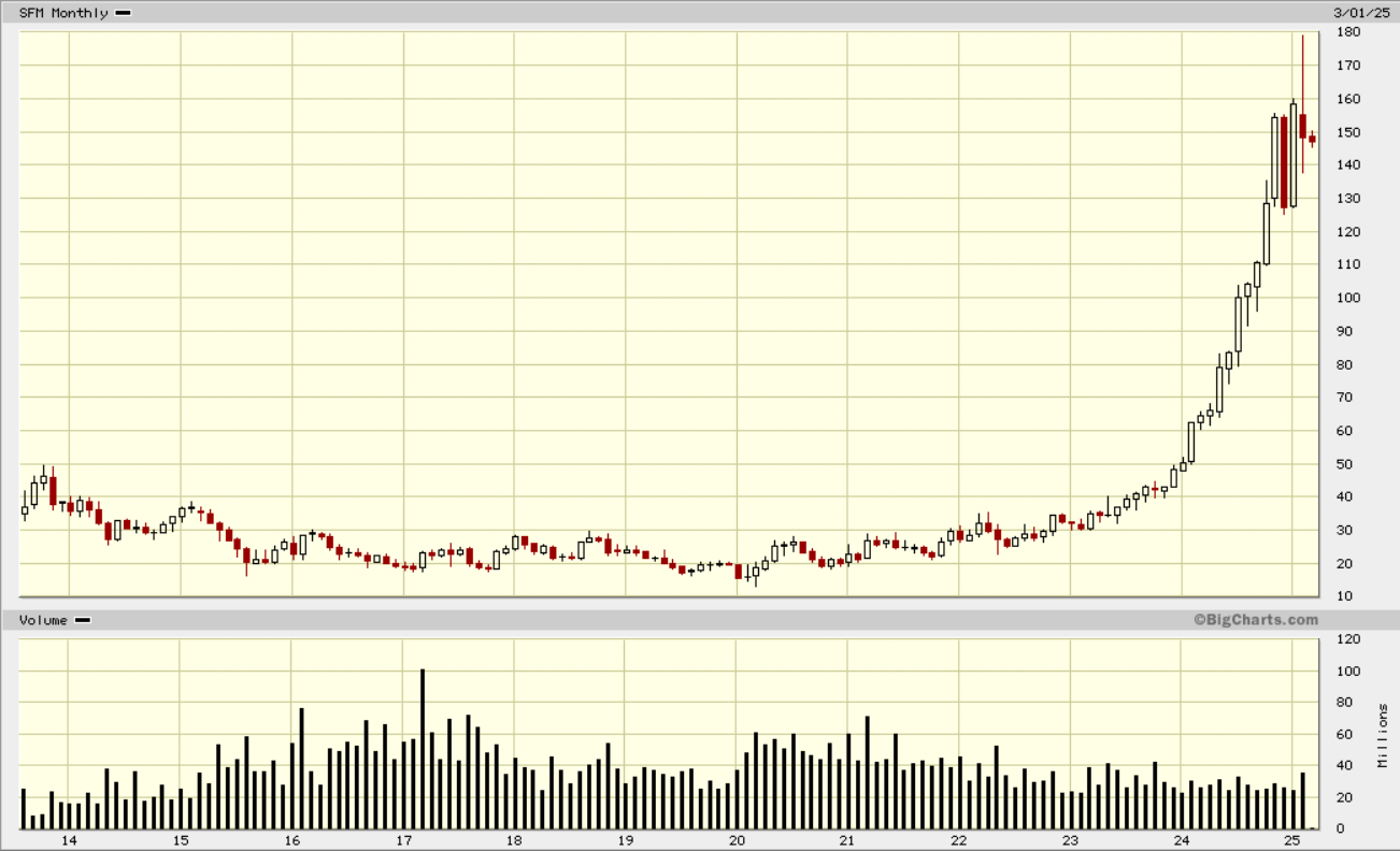 Thank you for the reply. I find the long-term base breakouts to be the most reliable and fruitful (more reliable and fruitful than buying on breaks above gradual downtrend lines with a few exceptions). SFM is a prime example of what I look for. Notice it broke out of a six year long base in 2022 then the overall bear market at the time temporarily dragged it down. However, if you held on you would be sitting on a 329% gain today. Below it are a couple of examples from Ted's book.