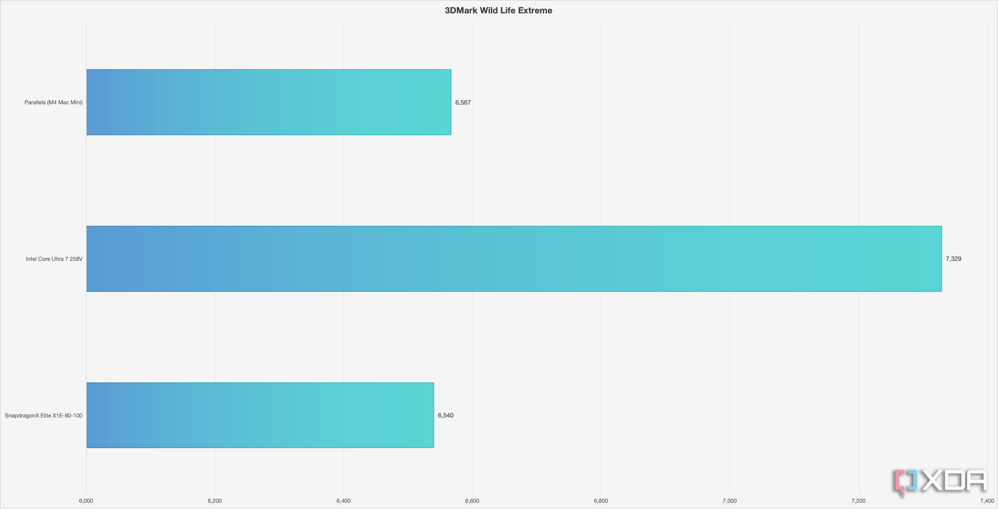 This time around, things are reversed a bit. Intel is the one who wins handily in this test, though it's not by a huge margin. The Apple M4 and Snapdragon X Elite are neck-and-neck in terms of benchmark scores here, which highlights just how capable the Apple M4 GPU is, and how the Snapdragon X Elite still has some ground to make if it wants to catch up with its competitors, even on Windows.