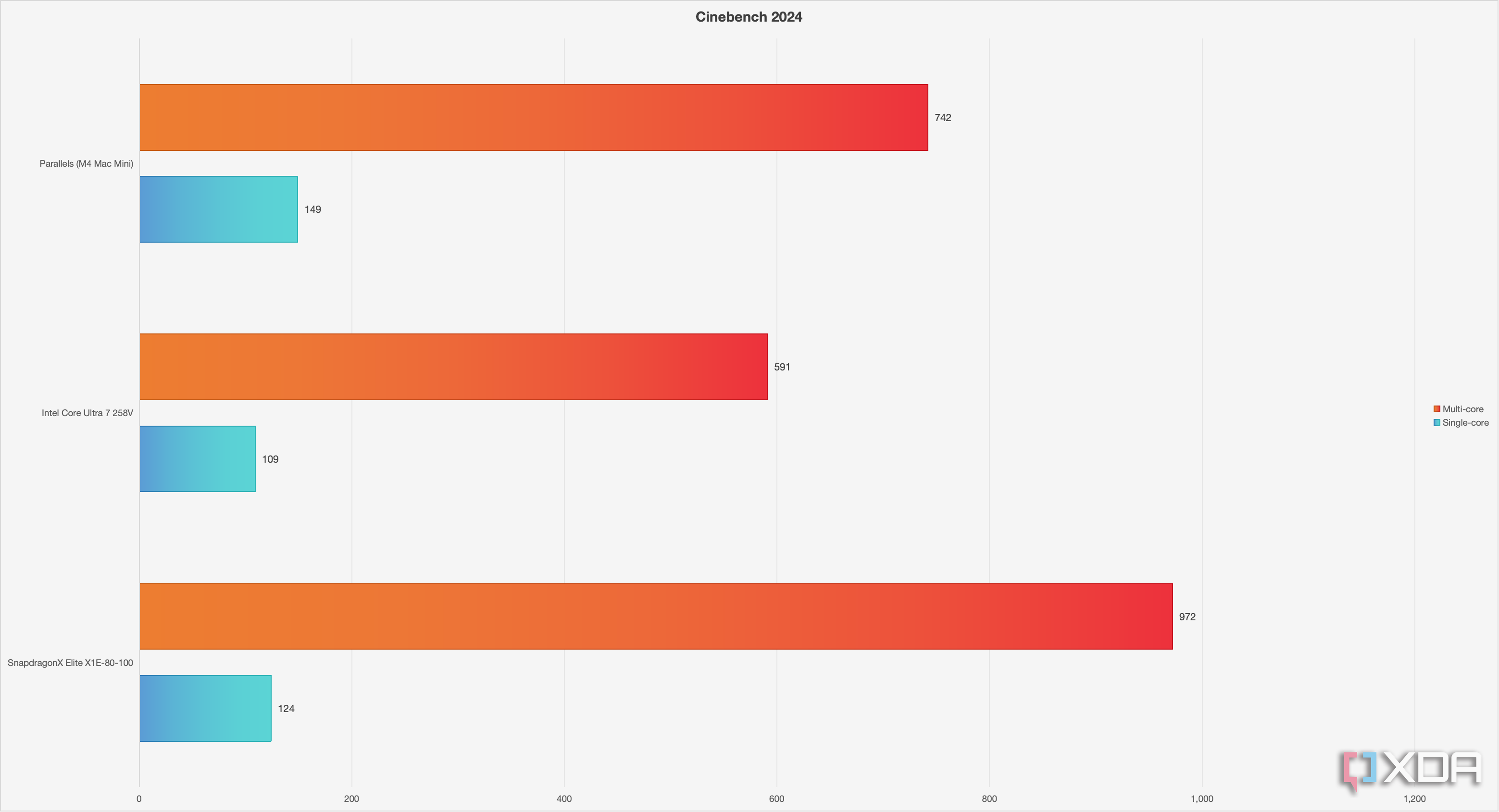 Next up, Cinebench 2024 is a much more demanding CPU test that runs for longer and pushes CPUs much harder. Despite being a somewhat different test, it tells a very similar story. The Snapdragon X Elite still comes out on top by far in multi-core performance, but the Apple M4 remains the best single-core performer, even through virtualization.