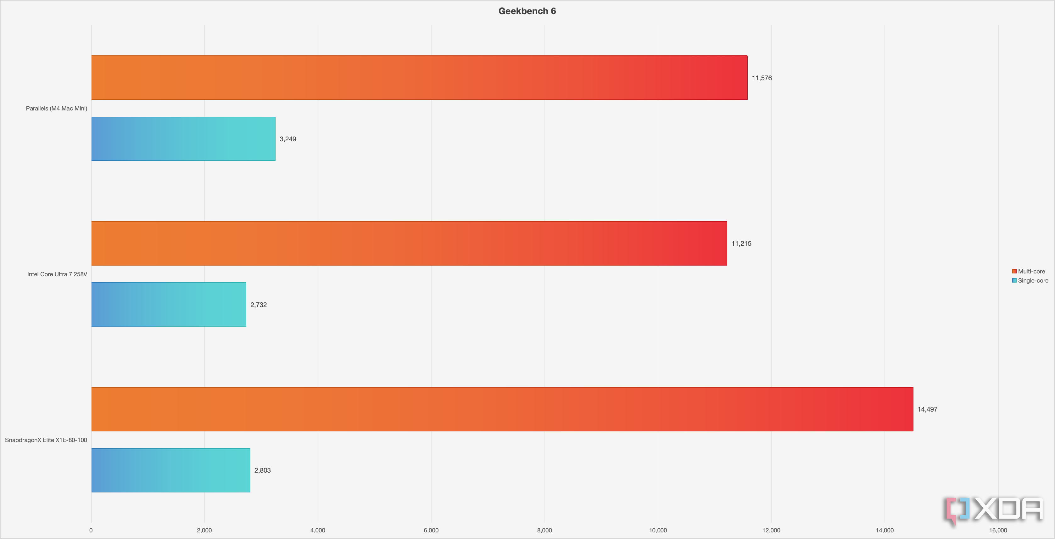Starting things off with the basics, we have Geekbench 6, the baseline test for CPU performance. This is a fairly lightweight one that's better for testing short-burst peak performance, and unsurprisingly, the real PC running Windows 11 on the Snapdragon X Elite pulled ahead by a wide margin in multi-core performance. After all, the Snapdragon X Elite was already extremely close to the native performance of the Apple M4, so with the virtualization layer and two fewer cores available, it was bound to happen. However, it's worth noting that the single-core test still puts Apple's processor comfortably ahead of the Snapdragon X Elite, which is nothing short of impressive.
