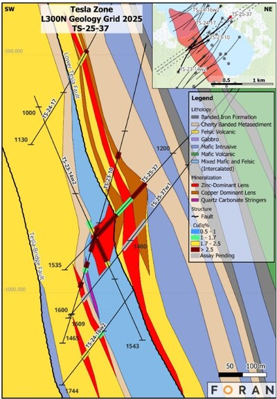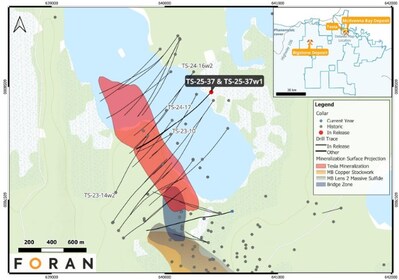 To date, Foran's drilling has defined multiple lenses of zinc and/or copper-rich mineralization over a strike length of at least 1,200m and 500-700m in the down dip direction at Tesla. The winter program is targeting a series of larger 200-300m gaps in the current drill spacing across the Tesla and Bridge Zones, utilizing wedging and directional drilling technologies to maintain the efficiency and precision of the drilling at tighter spacings. A plan map showing the location of TS-25-37 relative to the previous drilling that currently defines the zone is provided in Figure 1 below.