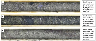 Figure 2 – Longitudinal cross section through the Tesla Zone Main Lens, showing the pierce points of historic drill holes that define the Zone, along with the hole trace and mineralized interval in TS-25-37. (CNW Group/Foran Mining Corporation) Figure 3. Photo examples and associated assays of lenses in TS-25-37 A) Clastic pyrite and interstitial sphalerite Zn-rich massive sulphide (1,310m); B) Chalcopyrite-rich, gold bearing copper stockwork zone hosted within felsic volcanics (1,401.5m); C) Interval of massive sulphide hosting significant sphalerite and chalcopyrite (1,407.4m) (CNW Group/Foran Mining Corporation)