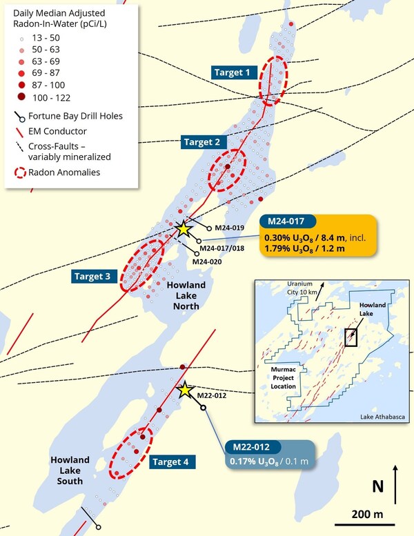 - High-Grade Follow-Up: Drilling to be focused at Howland Lake North on targets along strike of drill hole M24-017 that intersected 8.40 m at 0.30% U3O8, with individual assays up to 13.80% U3O8 over 0.10 m. Additional drilling is planned at Howland Lake South, along strike of drill hole M22-012 that intersected 0.17% U3O8 over 0.10 m.