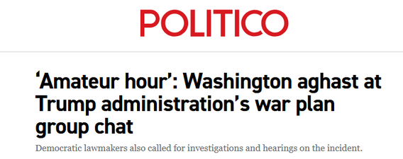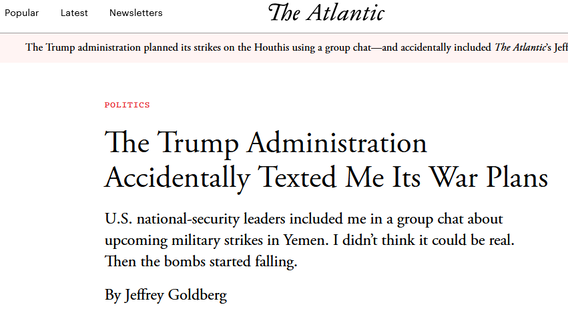 Hegseth leads national security war planning talks to bomb Houthis in Yemen (an act of war) on unsecured "Signal Chat" group, that also included a reporter for the leftist The Atlantic magazine (and of course he just leaked it, and wrote a bombshell public story about it, see below).