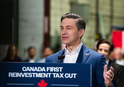 Conservative Leader Pierre Poilievre holds a campaign event at Petro Plastics Corporation Ltd. in Toronto on March 30, 2025.