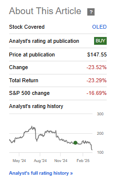 - I view OLED as a “Buy” here and may establish an initial position in the company. I give the company a current price target of around $150. This new PT takes into account tariffs and geopolitical uncertainty, but as you can see, still comes with an upside of over 20% as of this time.