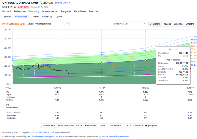 F.A.S.T graphs OLED Upside (F.A.S.T graphs OLED Upside) That is what you see below. The lowest annualized upside based on a P/E close to 23x that I would consider valid for this company-and it's still over 18% per year, inclusive of dividends. I will reiterate-this is not my first choice in this market. It's not even my second one. But this company, unlike others, is not a speculative play. Based on earnings estimates and historicals, I say that there is a significant upside to the company here, and one that you shouldn't underestimate. My price target, or PT, which cuts the estimate and fair value by around 12% based on tariff and geopolitical impacts as well as margin pressure, comes to $150/share, or around a 22-23x 2027E PT based on the current estimate of $7.2/share.