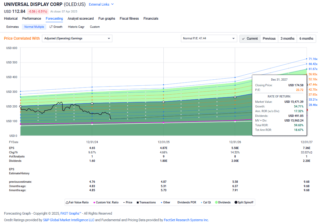 Because the current estimated earnings growth shows us a direction, I believe to be accurate. I believe earnings growth for OLED, regardless of the outcome of tariffs, will be a positive one. That means the only question is future multiples and future estimates. Current forecasts go up to 17-18% per year for the next few years. I'm willing to cut that to around 15-16%, discounting both for margin impacts from tariffs and current geopolitical risks, weighted against the upside from volumes and new customers and products.