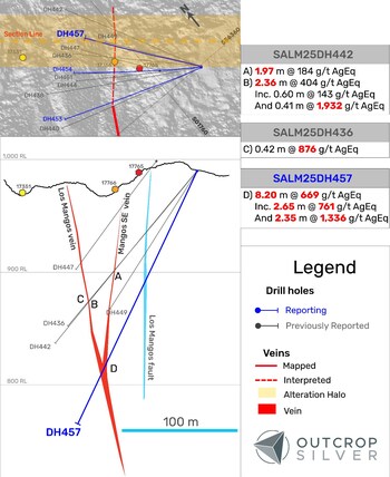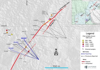The latest drilling campaign has returned exceptional results, highlighted by hole DH457 which intercepted 8.20 metres at 669 grams per tonne silver equivalent (Table 1). This represent one of the most robust intercepts to date from our target area, located over 8 kilometres south of the nearest defined resource. These results support Outcrop Silver's strategy of expanding high-grade mineralization through significant step-outs along the fully permitted 17 kilometre mineralized vein corridor.