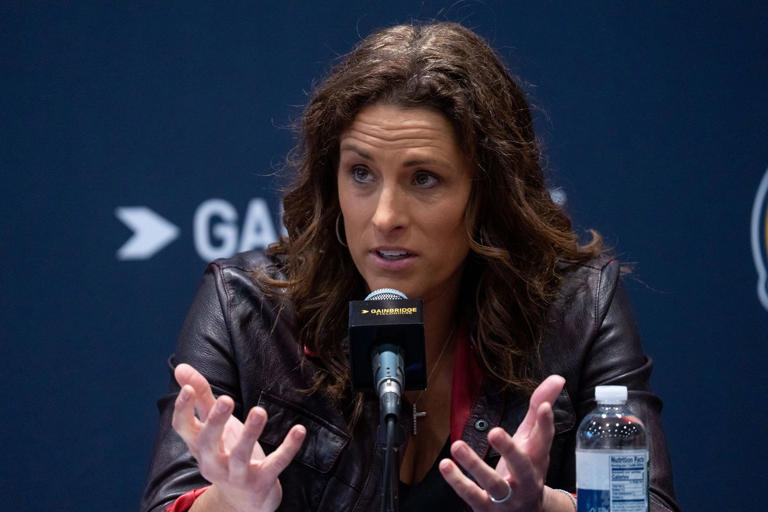 Stephanie White, new Indiana Fever head coach, speaks Monday, Nov. 4, 2024, during a press conference held on Salesforce Court at Gainbridge Fieldhouse in Indianapolis.