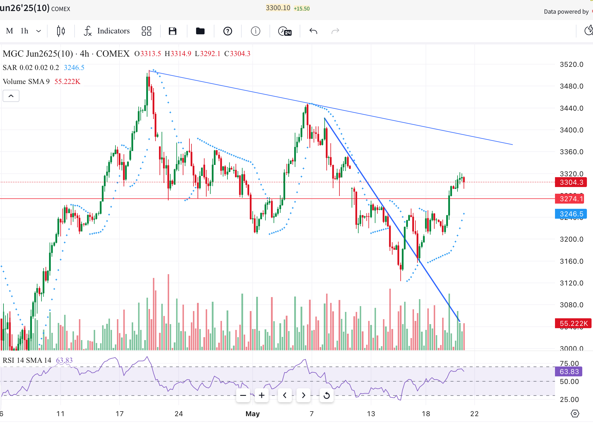 GC, hourly chart. To me, this looks bullish. The giveaway, really, was that the original decline off the top was a clear three-waver. We're likely in W 4 of 3 of a larger 1 off the recent low. Confirmation above 3450.
