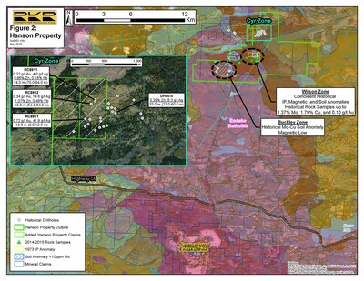 The Hanson Property is accessed from extensive logging roads in the 2018 Shovel Lake fire area approximately 20 km north of the past producing Endako Molybdenum Mine. The Property is situated near a major structural intersection with potential for three distinct periods of mineralizing events: late Jurassic porphyry Mo, late Cretaceous porphyry Cu-Mo, and early Eocene porphyry Cu-Au. The Hanson Property has been subject to multiple exploration programs since 1965. Significant soil Mo-Cu anomalies at the Buckley and Wilson Zones were generated in 1973 by Endako Mines. Shallow drilling of these anomalies, less than 155 m in each drillhole, was delayed until 1977-1978. Since then, rock samples with up 1.37% Mo, 1.79% Cu, and 0.10 g/t Au were been collected from the Wilson Zone in 20151 and a 2012 airborne magnetic and ZTEM survey imaged geophysical anomalies coincident with the older geochemical anomalies with very little follow-up work.