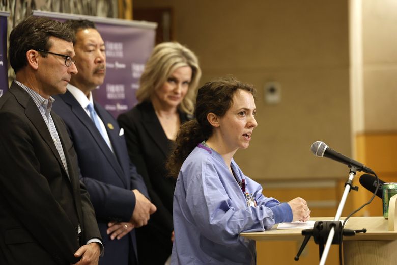 Nurse Sam Conley speaks while Gov. Bob Ferguson, left, Seattle Mayor Bruce Harrell, and Sommer Kleweno Walley, right, Harborview CEO, listen at a press conference at the Harborview Medical Center Research... (Karen Ducey / The Seattle Times)