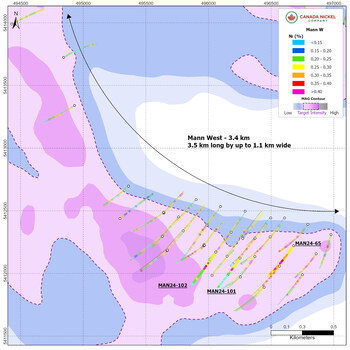 Figure 2. – Mann West – CNC Drillholes Over Total Magnetic Intensity (CNW Group/Canada Nickel Company Inc.)