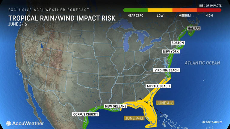 It is still too soon to tell what path either storm will take. However, AccuWeather meteorologists are saying there's a low risk of tropical rain and wind impacts for Mississippi, Alabama, Florida, Georgia, South Carolina and North Carolina. A near-zero risk is in place for the Texas and Louisiana coastlines, as well as the East Coast from Northern North Carolina through Maine.