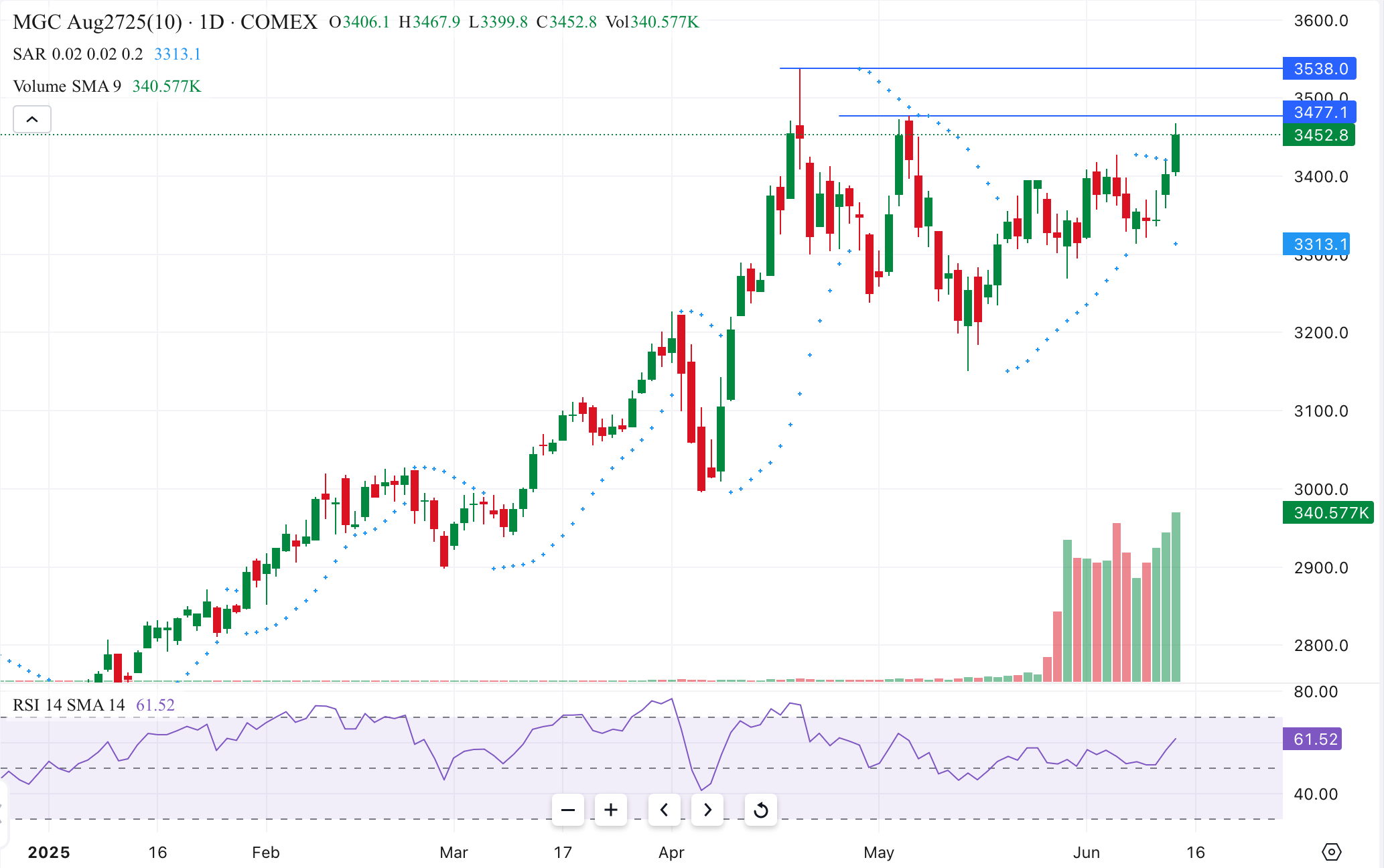 Looks like the hypothesis that the Gold range of the past few months was a Flat correction is working out. If so, it should soon take out the May high. And, apparently, to keep going.