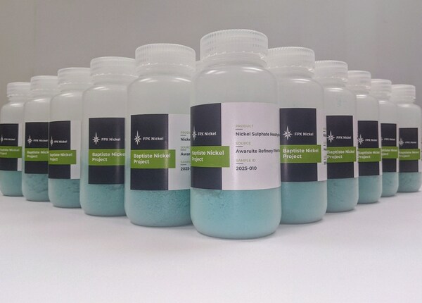 VANCOUVER, BC, June 17, 2025 /CNW/ - FPX Nickel Corp. (TSXV: FPX) (OTCQB: FPOCF) ("FPX" or the "Company") is pleased to announce successful production of additional battery-grade nickel sulphate from its Baptiste Nickel Project ("Baptiste" or the "Project"). Building on the success of previous testing campaigns, a production run was completed to produce larger quantities of nickel sulphate crystals. The nickel sulphate samples, which meet the strict target specifications for battery applications, will be provided to selected prospective downstream partners including pCAM producers, battery companies, and automakers pursuing supply security, traceable sourcing, and low carbon intensity production.