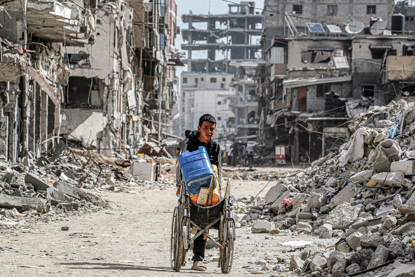 A boy pushes a wheelchair carrying water containers past the rubble of destroyed buildings and homes in Khan Younis in the southern Gaza Strip on July 8, 2024. Photo by Bashar Taleb/AFP via Getty Images Similarly, I have watched with amazement the build-up to Israel’s starvation plan in Gaza. At the start of Israel’s attack on Gaza, we heard then-Defense Minister Yoav Gallant, now wanted by the International Criminal Court on war crimes charges, speak of cutting off water, fuel, food, and electricity supplies. There were no expressions of horror by Israelis.