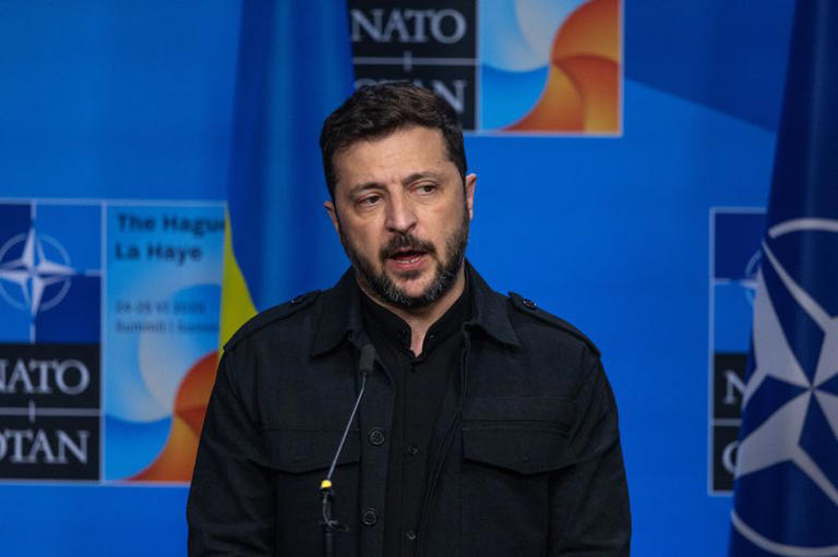 THE HAGUE, NETHERLANDS - JUNE 24: Volodymyr Zelenskyy, President of Ukraine, speaks during a press conference before a meeting during the NATO summit on June 24, 2025 in The Hague, Netherlands. This year's NATO summit, which brings together heads of state and government from across the military alliance, is being held in the Netherlands for the first time. Among other matters, members are to approve a new defense investment plan that raises target for defense spending to 5% of GDP. (Photo by Omar Havana/Getty Images)© Reach Publishing Services Limited