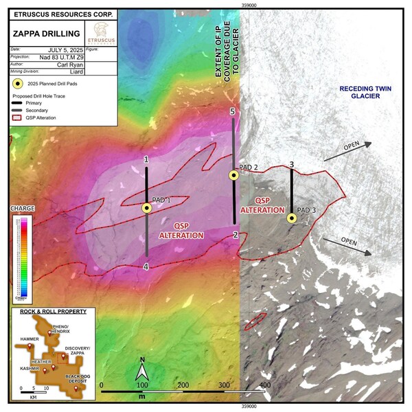 "We are extremely excited to commence our first ever drill program at the Zappa Target" commented Fiore Aliperti, President and CEO of Etruscus Resources. "In a region as well-endowed as the Golden Triangle, it's exceptional to have an untested hydrothermal system with such compelling geological and geophysical signatures. The recent glacial retreat has provided us with greater access to previously hidden mineralization, and we believe Zappa represents one of the most promising copper-gold porphyry targets in the region. We look forward to sharing results with our shareholders as we unlock the potential of this property."