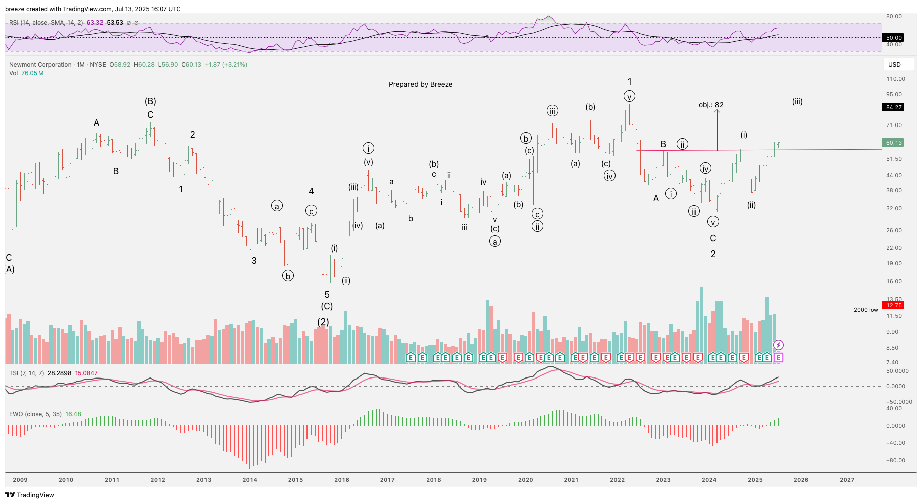 NEM Wave Count Update. Wave (iii) is in play with a target of 84.27. Note breakout from a continuation H&S formation that projects on objective of 82. Breeze