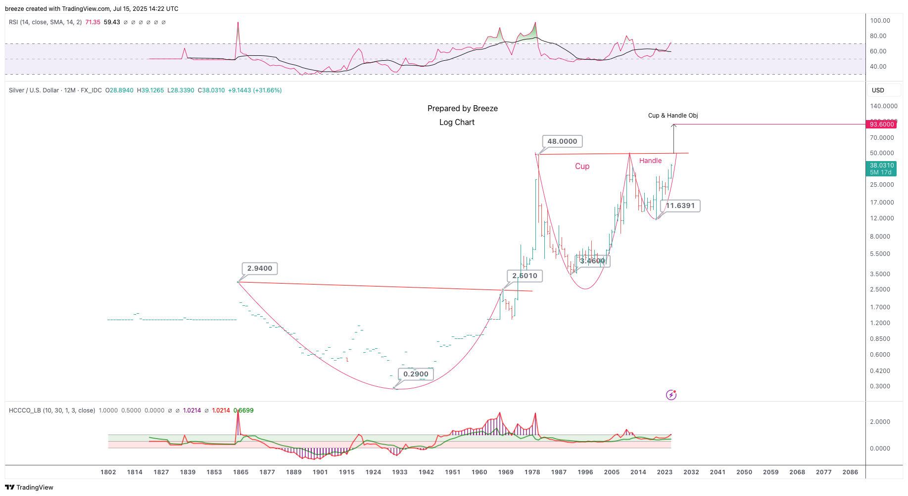 Spot Silver Yearly Chart from the year 1802. Note the two technical patterns. The first was a large consolidation that broke out from 2.50 to 48. And the second a large cup&handle formation. A breakout of its neckline projects an objective of 93.60. Breeze
