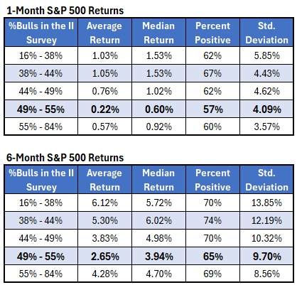 We have data on the II survey since 1972. The table below summarizes how the S&P 500 performed over the next month, based on percentage of bullish newsletters in the II sentiment survey. The bracket ranges were formed so that each bracket has the same number of returns. Unfortunately, the recent spike to 51% puts the figure in that 49% to 55% range, which is the range in which the index has performed the worst. Over the next month, the SPX averaged a return of 0.22%, with 57% of the returns positive.