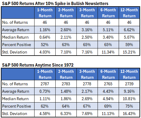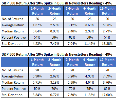 Jump in Bullish Newsletters One question I had was whether the spike in bullish newsletters created buying pressure, as the public read the arguments to buy stocks. The data below supports this theory. After a one-week jump in bullish newsletters by 10% or more, there is outperformance going forward, especially in the shorter term. For example, in the two months after the spike, the SPX averaged a return of 2.6% compared to a typical return of 1.48% for that timeframe. There’s outperformance after a spike in each of the timeframes out to six months. However, there’s underperformance after one year.
