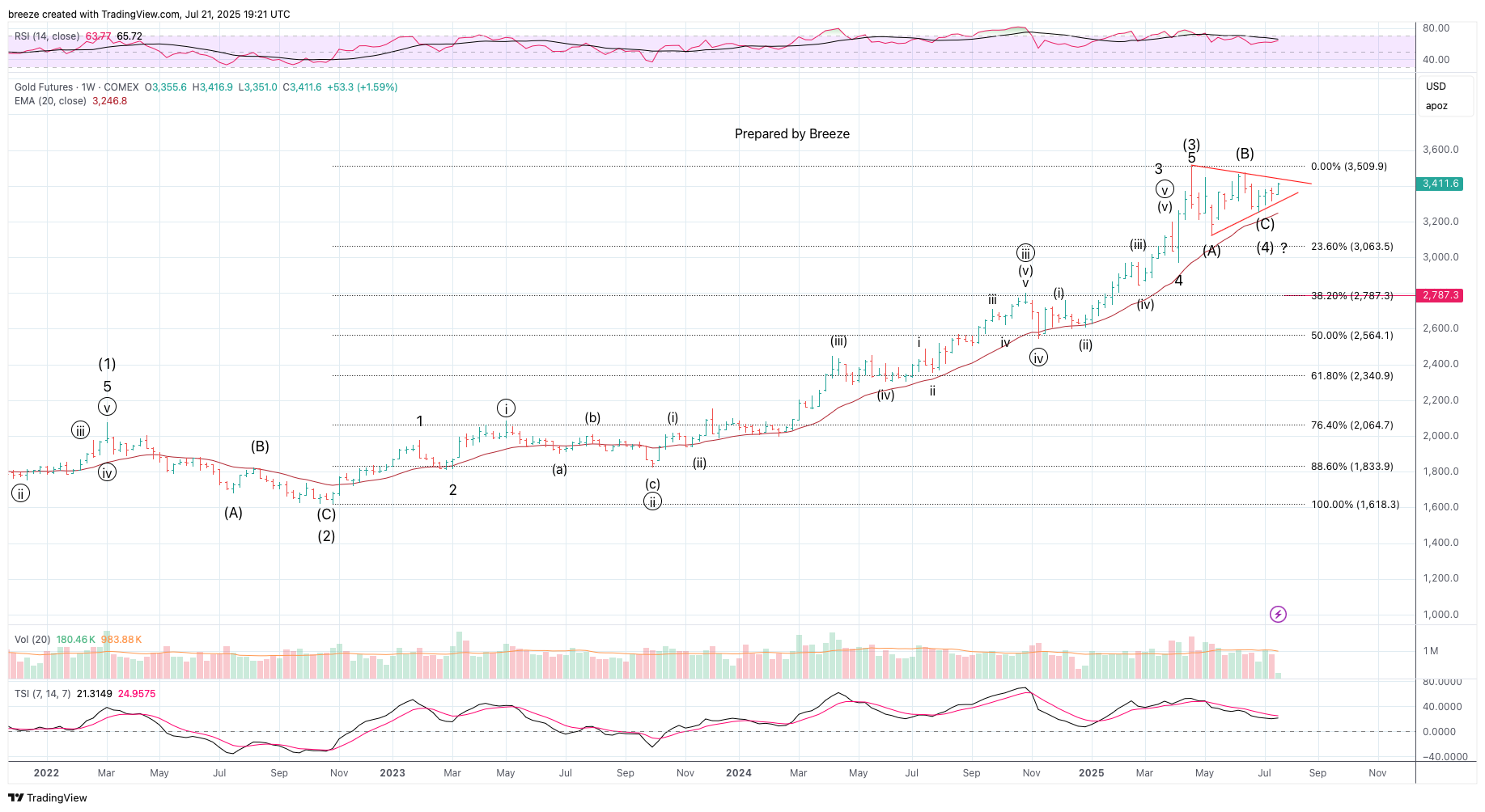 Gold Futures Wave Count Update. Typically, that Wave (4) would pullback to the 38.2% retracement level. That is what I was anticipating. However, a wave four can unfold as a triangle. If this breakout to the upside that would be very bullish. Breeze