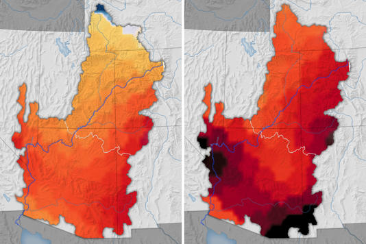 NASA satellite map images showing the loss of groundwater in the Colorado River Basin from 2002 to 2014 (left) and from 2015 to 2024 (right). © NASA Earth Observatory