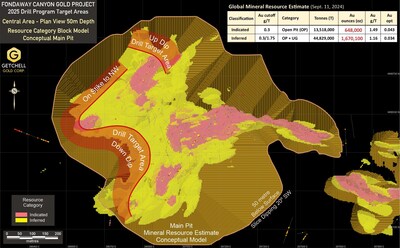 Figure 1: Fondaway Canyon - First drill hole of 2025 drill program (source: Foraco Drilling) (CNW Group/Getchell Gold Corp.) Figure 2: Fondaway Canyon 2025 Drill Target Areas - Main Pit Plan View - MRE 50m depth slice (CNW Group/Getchell Gold Corp.)