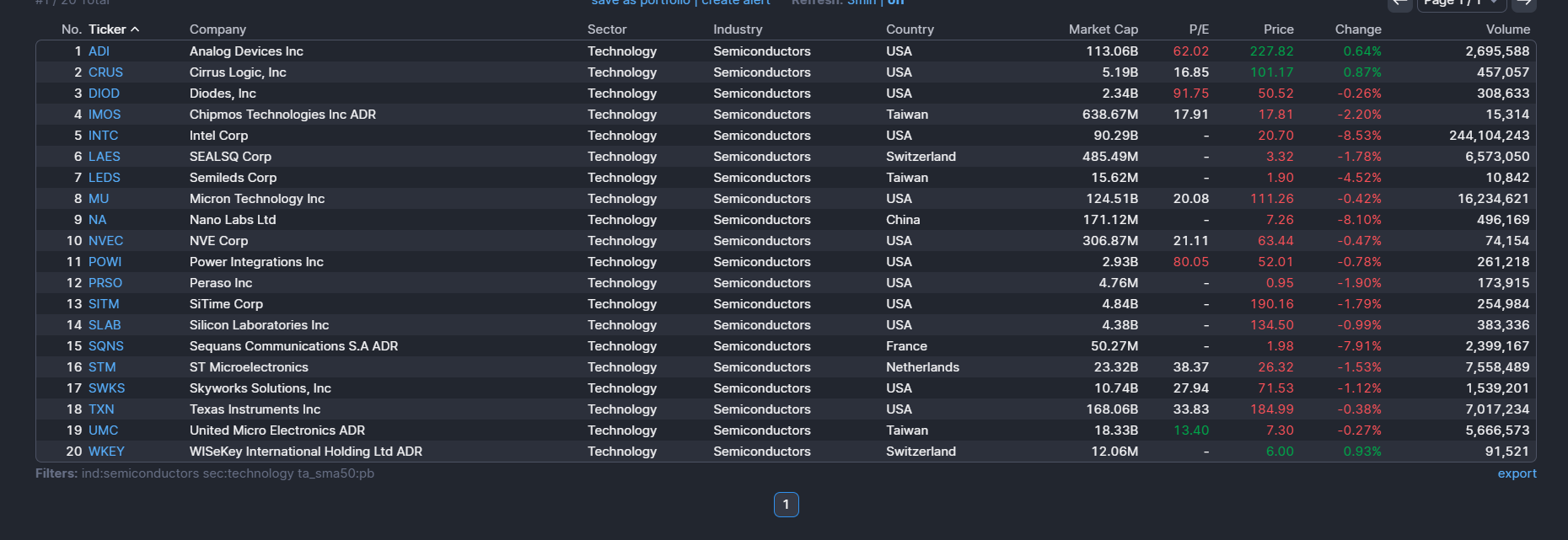 Semiconductor stocks below their 50 day SMA. Typically a trend change indicator.