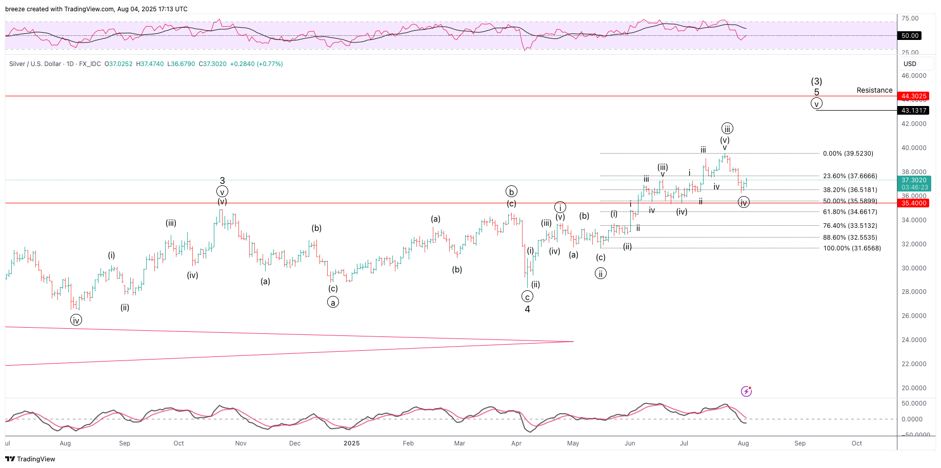 Spot Silver Wave Count Update. Minute Wave (circle) iv appears complete. If so then Minute Wave (circle) v of Minor 5 of Intermediate Wave (3) is in play with a target of 43.13. Breeze