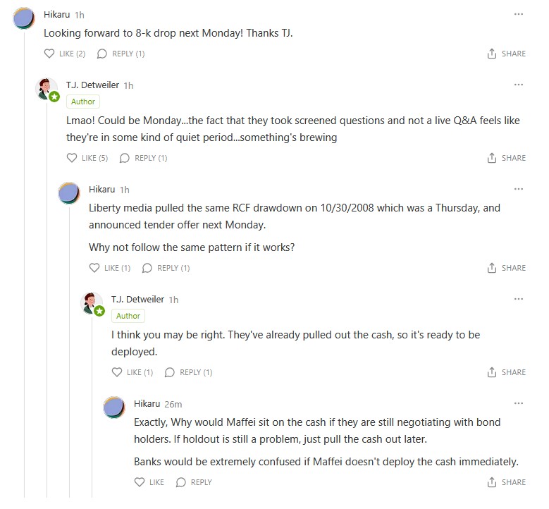 And as a reminder QVC Group hired Kirkland and Evercore and then bondholders hired PJT Partners & David Polk & Warwell and then LITNA holders hired Centerview & Akin Gump Strauss. QVC is of course paying for their two firms but normally they reimburse the bondholders here too so they're likely paying six firms. Throw in $100K for Carl and Roger and in six months that's $600K gone. They just burned ($156M) in six months running the business and even QVC, Inc. FCF was ($75M). So they're buying bonds the poster says but I again ask which? Can they get them all? Are all senior holders in agreement? Does this seem probable or speculative?