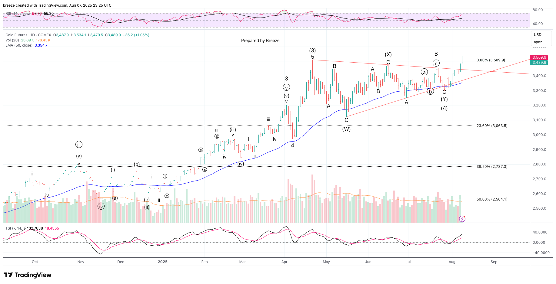 Gold Continuous Futures Wave Count Update. ATH price printed today. Intermediate Wave (5) is in play with a target of 4,828. Breeze