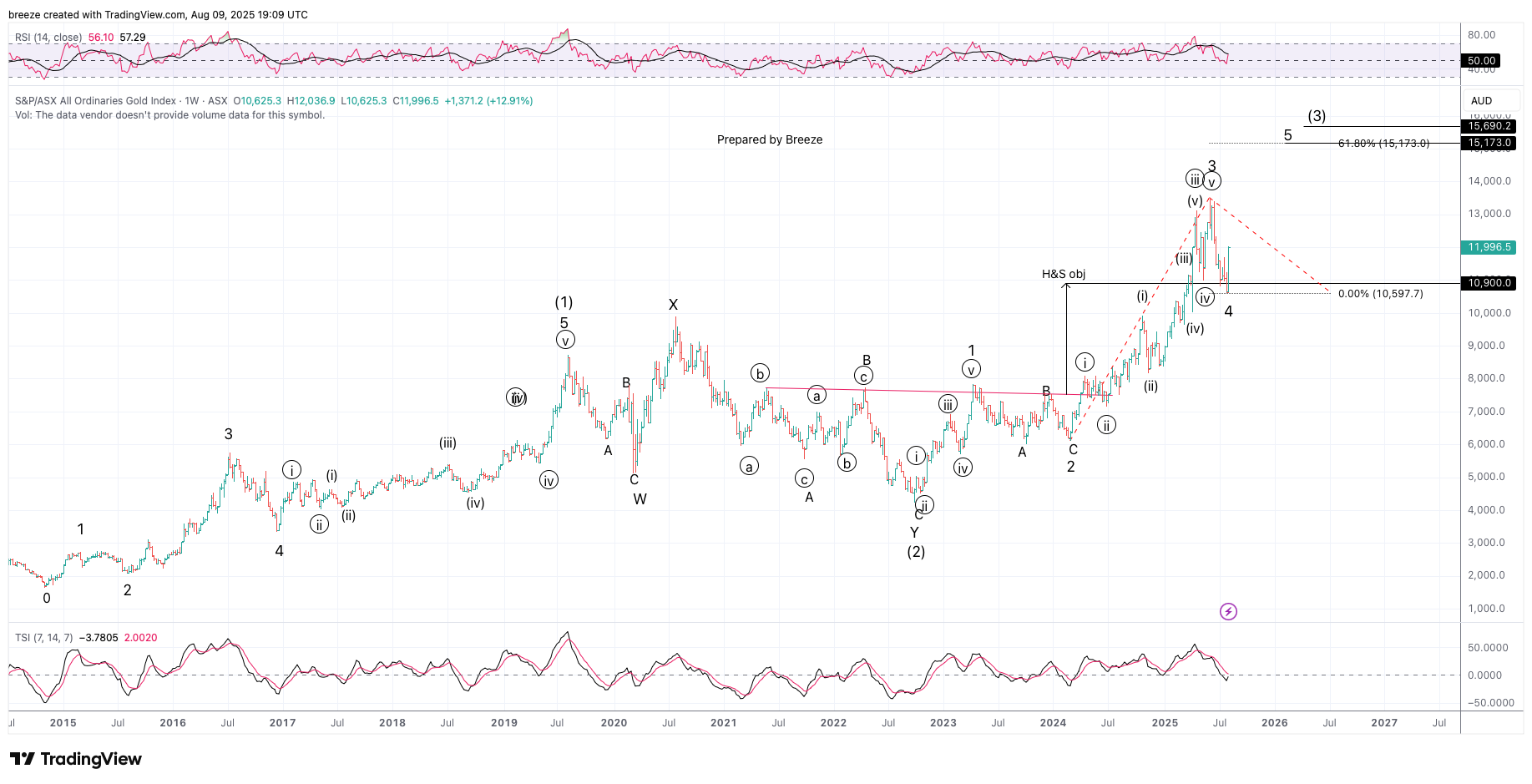 S&P/ASX All Ordinaries Gold Index Wave Count Update Minor Wave 4 of Intermediate Wave (3) is in play with a target of 15,173. But could hit 15,590. Breeze