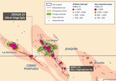 Figure 2: Plan view map of significant intercepts at Joaquin  (historical and new) (Source: Unico quarterly activities report dated  July 30, 2025) (CNW Group/Metalla Royalty & Streaming Ltd.)