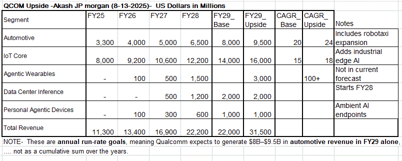 A- Yes—Akash Palkhiwala did mention several initiatives and product categories that are not yet included in Qualcomm’s formal forecast targets, which is notable given Jim’s focus on modeling upside scenarios and tracking forecast discipline. Here are the key items: