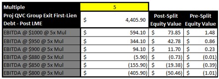The company made $2,146M disappear off the books and has a cash interest savings of $132.08M annually plus they also made $1,270M in preferred equity go away which will also save $101M annually. Issue here is the $101M is kind of a non-issue for QVC, Inc because the will pay the parent a dividend regardless and whatever the parent did with the cash was the parents use and currently QVC, Inc has been restricted and the dividend they pay to parent has not included preferred coverage. At 5x multiple the equity is still pretty much worthless at $900M EBITDA but I suppose at $950M EBITDA that’s enough for some QVCGA holders who bought in at $0.60 to feel there’s a path to recovery, especially as many kept DCA on the way down. Problem is this is not really a real-world value creation for the company thus making the LME less likely to happen given what it would cost to execute. A 5x multiple is also within historical limits for QVC and given their main distribution path is in secular decline, EBITDA is not stable, I do not see them getting beyond a 5x even post LME as earnings would not support. We can see have much $50M of EBITDA swings the valuation.