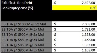 And the other risk as I mentioned is credit facility, with $2,900M drawn, gets refinanced in post-LME world with a higher rate. Given leverage is still high, bond holders just got haircuts, and EBITDA is still in decline, ratings agencies will likely not upgrade them meaning pricing of debt will be in their B/CCC+ ratings and where SOFR is + B spreads I would expect them to be +9% and I currently model 9.055% (9.06% rounded). This drastically changes the interest savings the company would receive as well: